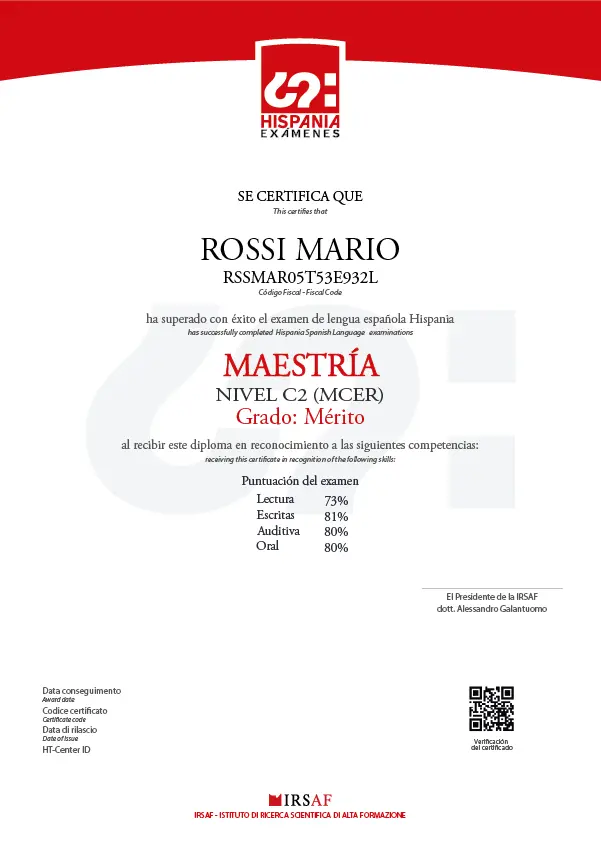 Scopri il facsimile ufficiale del certificato HISPANIA EXÁMENES e approfondisci tutti i dettagli del documento