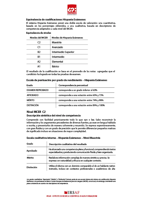 I gradi qualitativi “Aprobado”, “Mérito” e “Distinción” rappresentano una scala interna al sistema di certificazione Hispania Exámenes e non fanno parte del Quadro Comune Europeo di Riferimento per le Lingue (QCER), con il quale restano comunque coerenti sul piano dei descrittori di competenza.